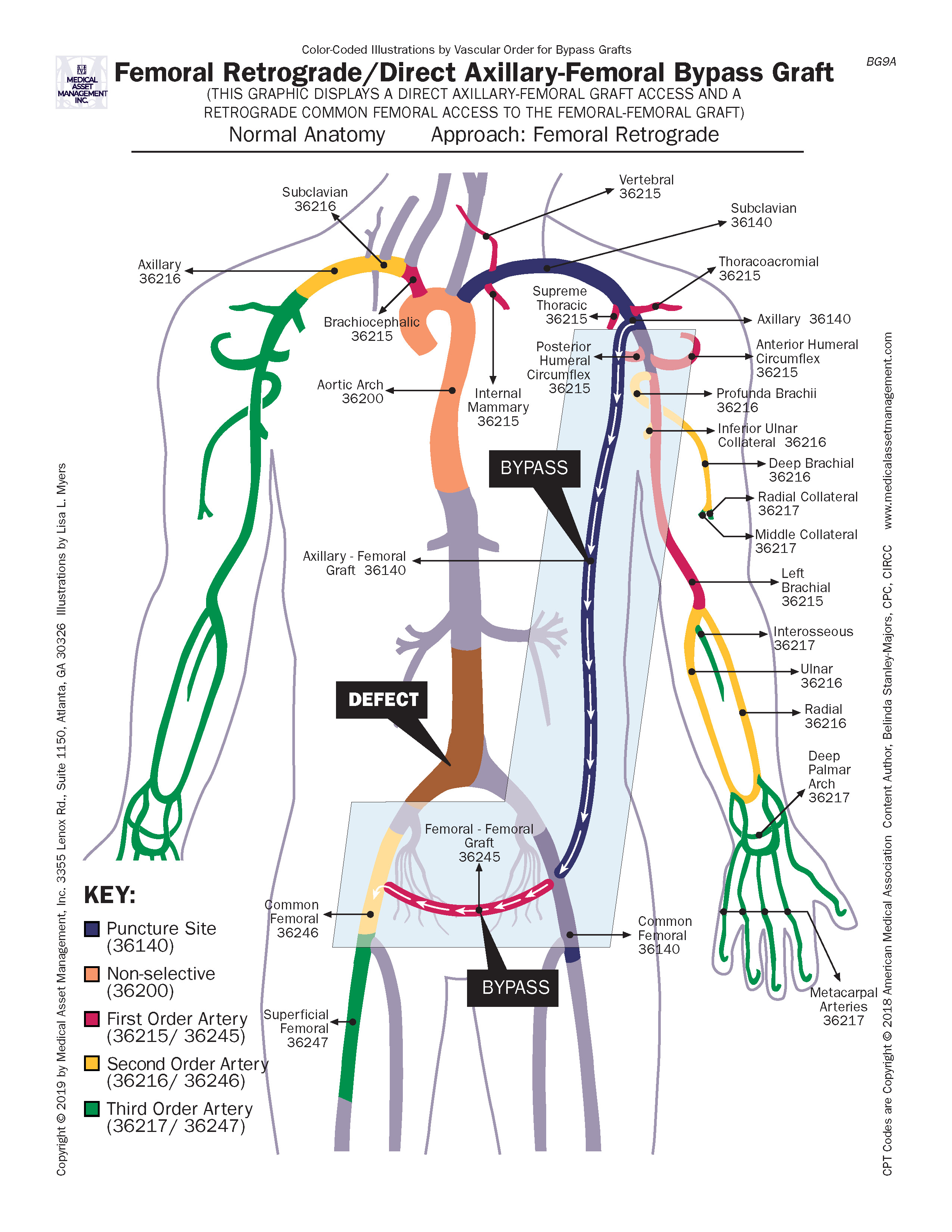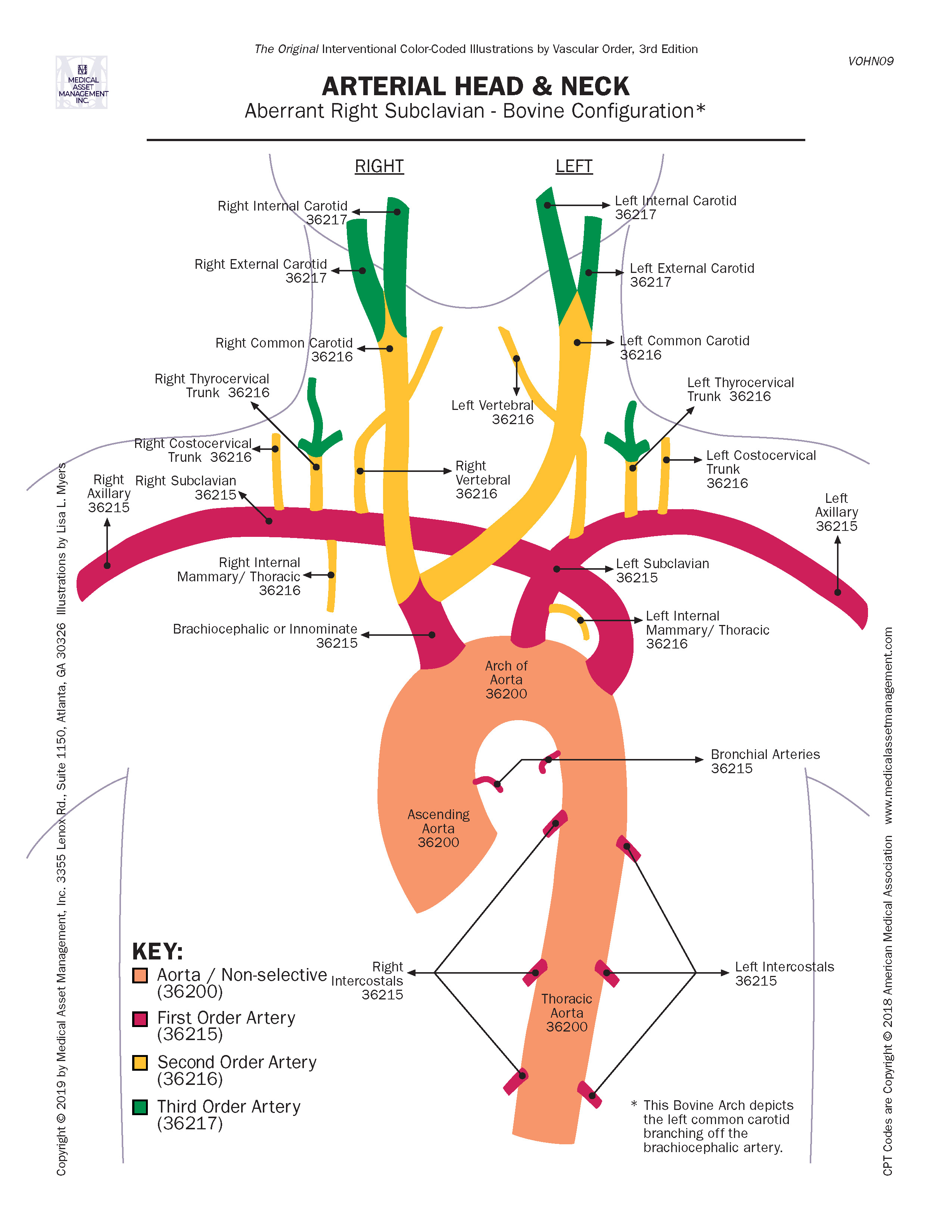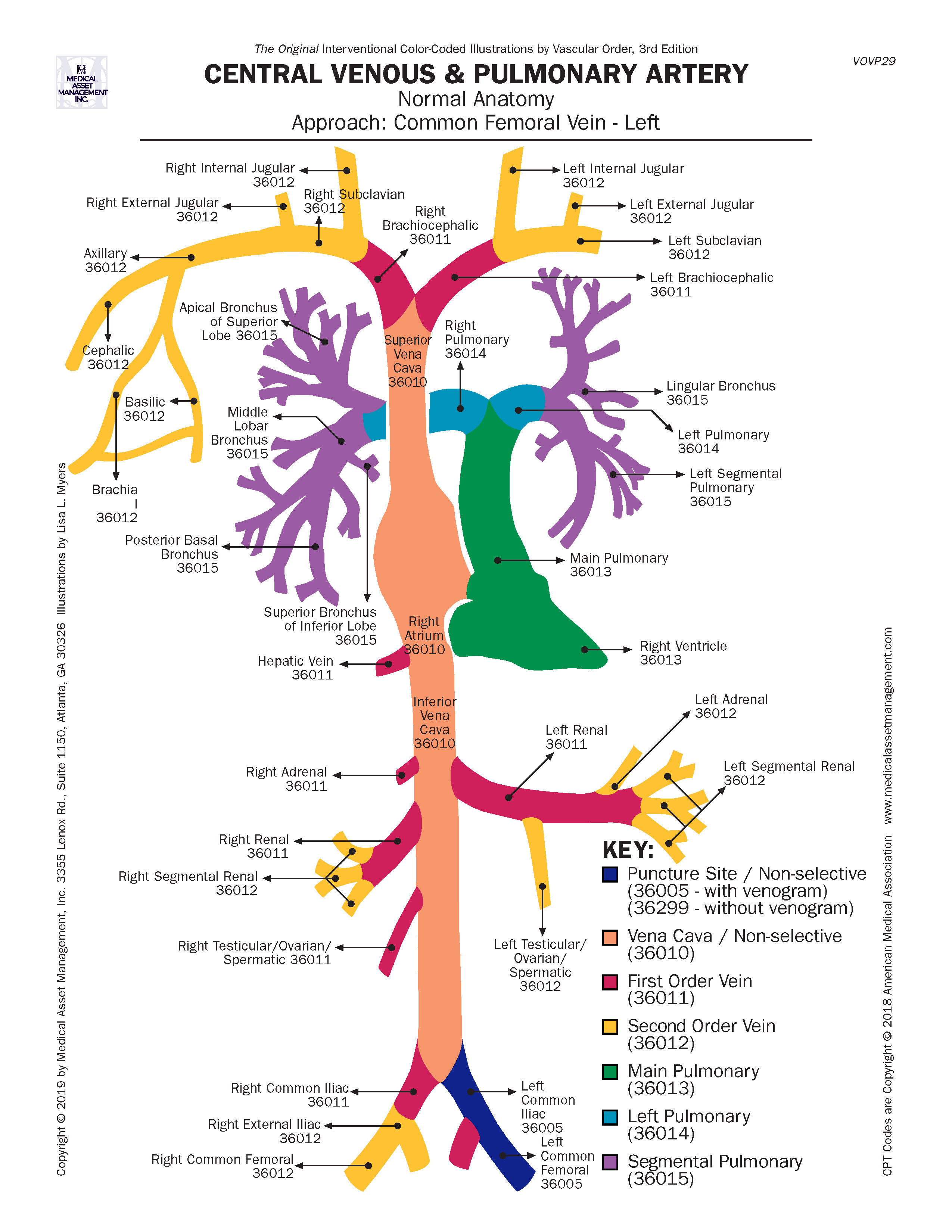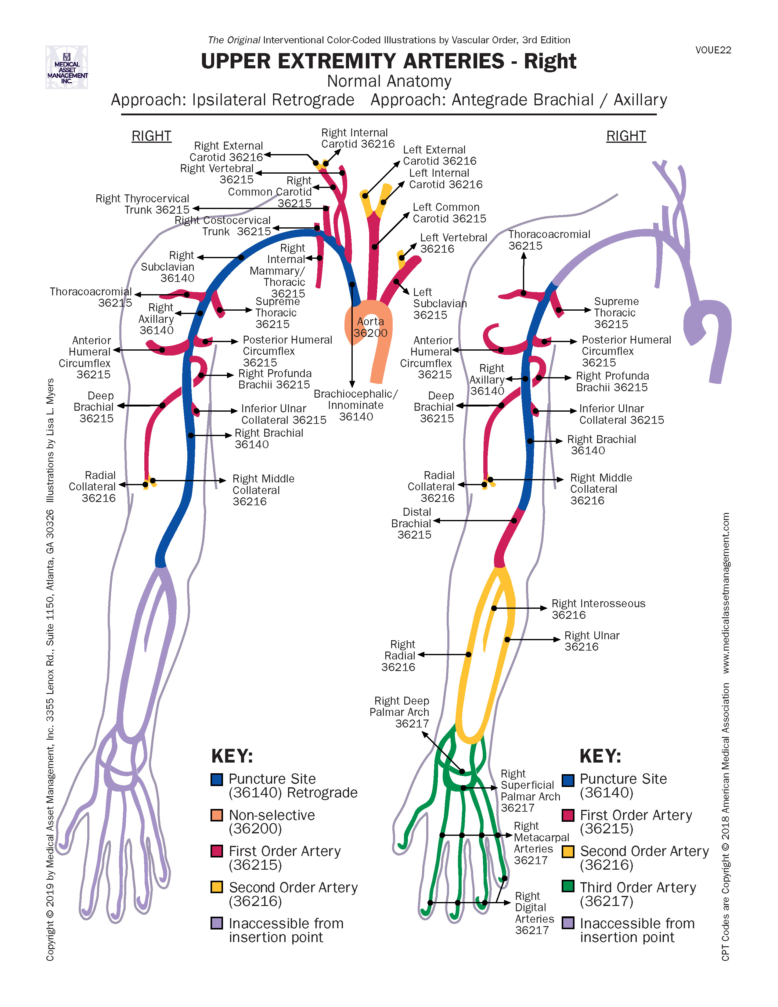 To improve upon the products available in the marketplace and assist the interventional code with this complex specialty, coloring according to non-selective and selective 1st, 2nd, and 3rd order vessels makes it easy to follow and understand your billing impact at a quick glance.